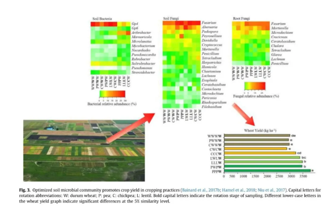 輪作是管理農(nóng)業(yè)生態(tài)系統(tǒng)生物多樣性的一種傳統(tǒng)而實(shí)用的方法,可以增強(qiáng)土壤健康,抑制病蟲(chóng)害爆發(fā),從而提高產(chǎn)量。作物輪作的價(jià)值和效率取決于幾個(gè)因素:作物類型用于旋轉(zhuǎn)、旋轉(zhuǎn)系列和某些作物的應(yīng)用頻率、旋轉(zhuǎn)長(zhǎng)度、農(nóng)業(yè)歷史農(nóng)田和土壤特性。這些因素可以在許多方面影響土壤健康。例如,作物輪作可以通過(guò)破壞與特定作物或作物基因型相關(guān)的土傳病原體的生命周期,為某些土壤功能微生物的生長(zhǎng)提供更好的機(jī)會(huì),限制病害壓力。
